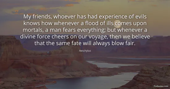 Aeschylus. (2026, January 17). My friends, whoever has had experience of evils knows how whenever a flood of ills comes upon mortals, a man fears everything; but whenever a divine force cheers on our voyage, then we believe that the same fate will always blow fair. FixQuotes. https://fixquotes.com/quotes/my-friends-whoever-has-had-experience-of-evils-38089/