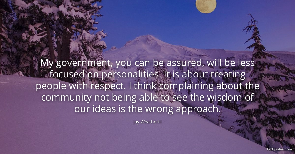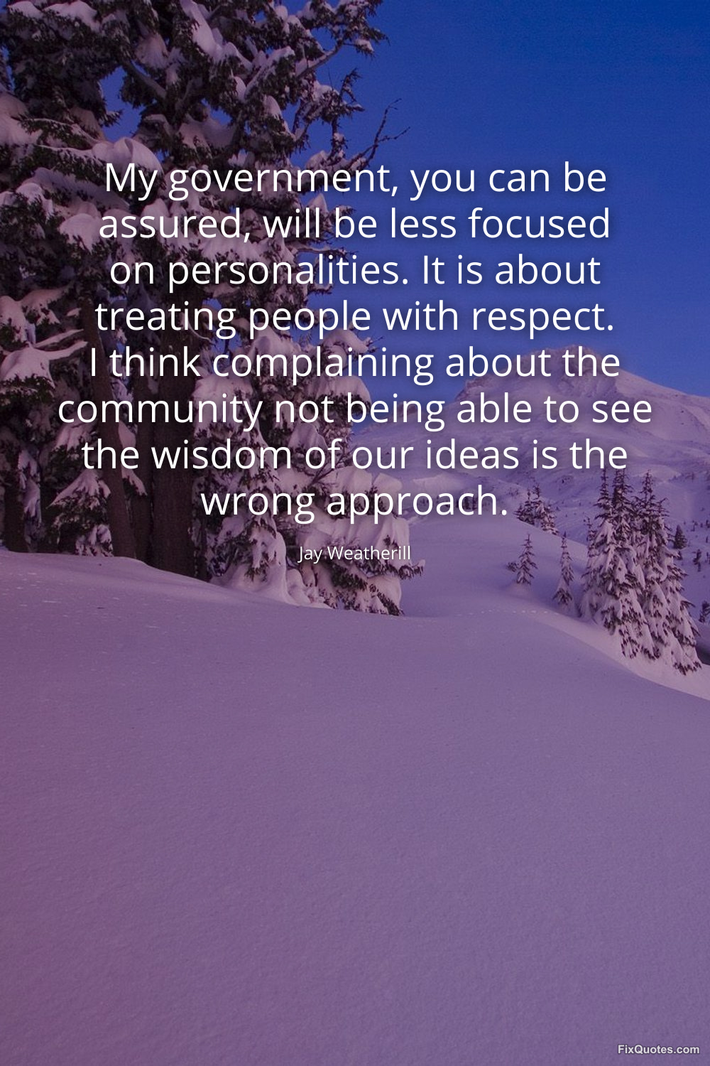 Weatherill, Jay. "My government, you can be assured, will be less focused on personalities. It is about treating people with respect. I think complaining about the community not being able to see the wisdom of our ideas is the wrong approach." FixQuotes. January 17, 2026. https://fixquotes.com/quotes/my-government-you-can-be-assured-will-be-less-78427/.