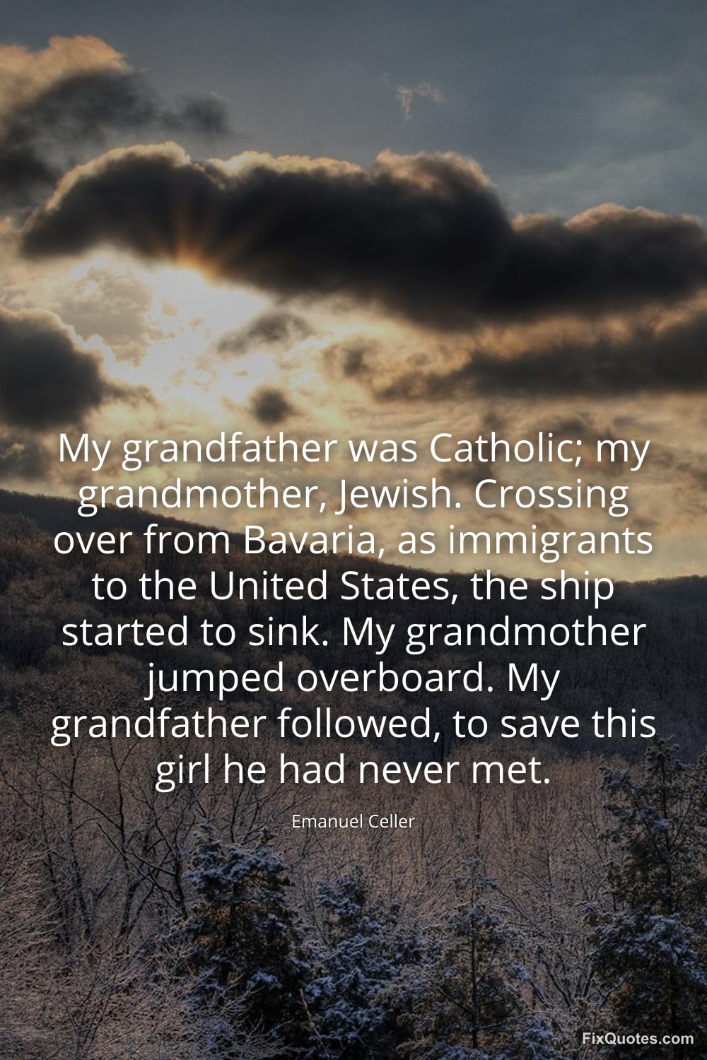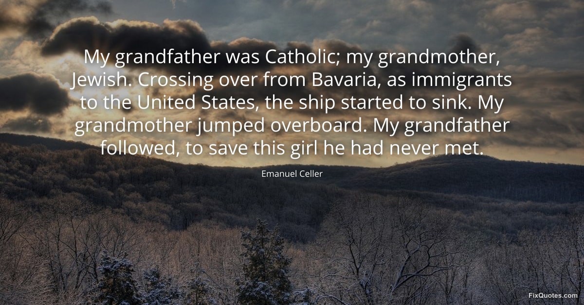Celler, Emanuel. "My grandfather was Catholic; my grandmother, Jewish. Crossing over from Bavaria, as immigrants to the United States, the ship started to sink. My grandmother jumped overboard. My grandfather followed, to save this girl he had never met." FixQuotes. January 17, 2026. https://fixquotes.com/quotes/my-grandfather-was-catholic-my-grandmother-jewish-50725/.