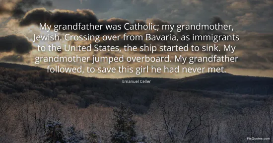 Celler, Emanuel. (2026, January 17). My grandfather was Catholic; my grandmother, Jewish. Crossing over from Bavaria, as immigrants to the United States, the ship started to sink. My grandmother jumped overboard. My grandfather followed, to save this girl he had never met. FixQuotes. https://fixquotes.com/quotes/my-grandfather-was-catholic-my-grandmother-jewish-50725/