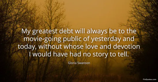 Swanson, Gloria. "My greatest debt will always be to the movie-going public of yesterday and today, without whose love and devotion I would have had no story to tell." FixQuotes. January 15, 2026. https://fixquotes.com/quotes/my-greatest-debt-will-always-be-to-the-156649/.