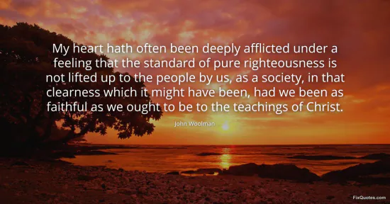 Woolman, John. "My heart hath often been deeply afflicted under a feeling that the standard of pure righteousness is not lifted up to the people by us, as a society, in that clearness which it might have been, had we been as faithful as we ought to be to the teachings of Christ." FixQuotes. January 15, 2026. https://fixquotes.com/quotes/my-heart-hath-often-been-deeply-afflicted-under-a-153637/.