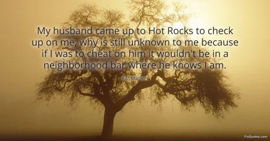 "My husband came up to Hot Rocks to check up on me, why is still unknown to me because if I was to cheat on him it wouldn't be in a neighborhood bar where he knows I am." FixQuotes, 16 Jan. 2026, https://fixquotes.com/quotes/my-husband-came-up-to-hot-rocks-to-check-up-on-me-122162/. Accessed 2 Mar. 2026.