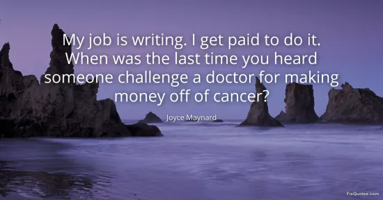 Maynard, Joyce. "My job is writing. I get paid to do it. When was the last time you heard someone challenge a doctor for making money off of cancer?" FixQuotes. January 16, 2026. https://fixquotes.com/quotes/my-job-is-writing-i-get-paid-to-do-it-when-was-91956/.