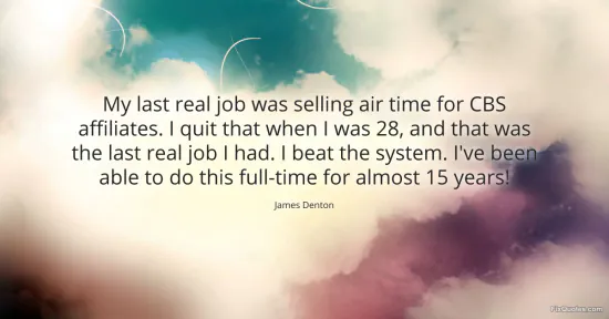 Denton, James. "My last real job was selling air time for CBS affiliates. I quit that when I was 28, and that was the last real job I had. I beat the system. I've been able to do this full-time for almost 15 years!" FixQuotes. February 18, 2026. https://fixquotes.com/quotes/my-last-real-job-was-selling-air-time-for-cbs-78137/.
