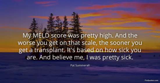 Summerall, Pat. "My MELD score was pretty high. And the worse you get on that scale, the sooner you get a transplant. It's based on how sick you are. And believe me, I was pretty sick." FixQuotes. January 15, 2026. https://fixquotes.com/quotes/my-meld-score-was-pretty-high-and-the-worse-you-159051/.