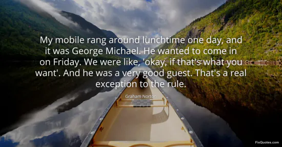 Norton, Graham. (2026, January 16). My mobile rang around lunchtime one day, and it was George Michael. He wanted to come in on Friday. We were like, 'okay, if that's what you want'. And he was a very good guest. That's a real exception to the rule. FixQuotes. https://fixquotes.com/quotes/my-mobile-rang-around-lunchtime-one-day-and-it-135578/
