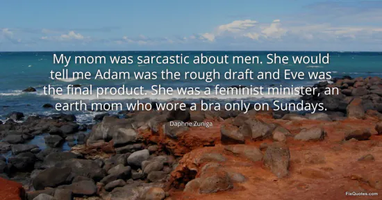 Zuniga, Daphne. "My mom was sarcastic about men. She would tell me Adam was the rough draft and Eve was the final product. She was a feminist minister, an earth mom who wore a bra only on Sundays." FixQuotes. January 16, 2026. https://fixquotes.com/quotes/my-mom-was-sarcastic-about-men-she-would-tell-me-124044/.
