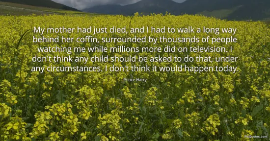 Harry, Prince. (2026, January 15). My mother had just died, and I had to walk a long way behind her coffin, surrounded by thousands of people watching me while millions more did on television. I don't think any child should be asked to do that, under any circumstances. I don't think it would happen today. FixQuotes. https://fixquotes.com/quotes/my-mother-had-just-died-and-i-had-to-walk-a-long-171809/