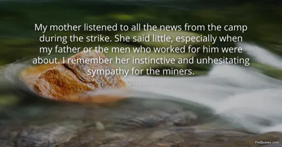 Smedley, Agnes. "My mother listened to all the news from the camp during the strike. She said little, especially when my father or the men who worked for him were about. I remember her instinctive and unhesitating sympathy for the miners." FixQuotes. February 19, 2026. https://fixquotes.com/quotes/my-mother-listened-to-all-the-news-from-the-camp-38384/.