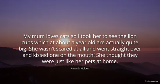 Holden, Amanda. (2026, January 16). My mum loves cats so I took her to see the lion cubs which at about a year old are actually quite big. She wasn't scared at all and went straight over and kissed one on the mouth! She thought they were just like her pets at home. FixQuotes. https://fixquotes.com/quotes/my-mum-loves-cats-so-i-took-her-to-see-the-lion-108625/