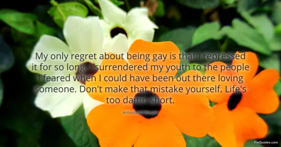 Maupin, Armistead. "My only regret about being gay is that I repressed it for so long. I surrendered my youth to the people I feared when I could have been out there loving someone. Don't make that mistake yourself. Life's too damn short." FixQuotes. January 17, 2026. https://fixquotes.com/quotes/my-only-regret-about-being-gay-is-that-i-63551/.