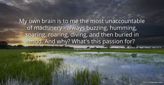 Woolf, Virginia. "My own brain is to me the most unaccountable of machinery - always buzzing, humming, soaring, roaring, diving, and then buried in mud. And why? What's this passion for?" FixQuotes. February 16, 2026. https://fixquotes.com/quotes/my-own-brain-is-to-me-the-most-unaccountable-of-36808/.