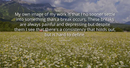 Krasner, Lee. "My own image of my work is that I no sooner settle into something than a break occurs. These breaks are always painful and depressing but despite them I see that there's a consistency that holds out, but is hard to define." FixQuotes. January 17, 2026. https://fixquotes.com/quotes/my-own-image-of-my-work-is-that-i-no-sooner-62431/.