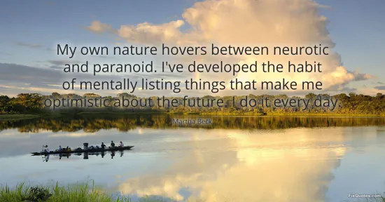 Beck, Martha. (2026, January 15). My own nature hovers between neurotic and paranoid. I've developed the habit of mentally listing things that make me optimistic about the future. I do it every day. FixQuotes. https://fixquotes.com/quotes/my-own-nature-hovers-between-neurotic-and-143146/