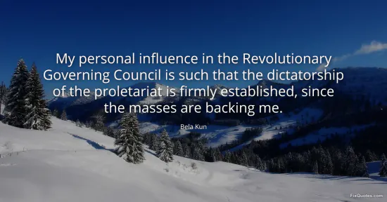 Kun, Bela. "My personal influence in the Revolutionary Governing Council is such that the dictatorship of the proletariat is firmly established, since the masses are backing me." FixQuotes. Accessed February 2, 2026. https://fixquotes.com/quotes/my-personal-influence-in-the-revolutionary-131577/.
