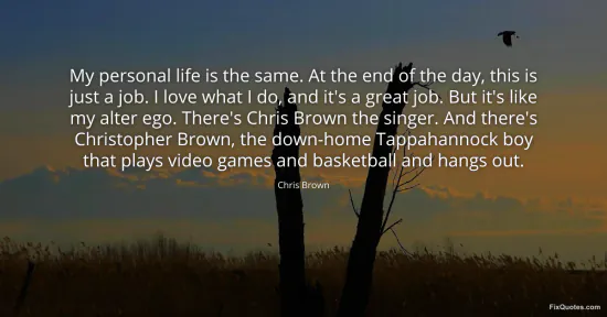 Brown, Chris. (2026, January 18). My personal life is the same. At the end of the day, this is just a job. I love what I do, and it's a great job. But it's like my alter ego. There's Chris Brown the singer. And there's Christopher Brown, the down-home Tappahannock boy that plays video games and basketball and hangs out. FixQuotes. https://fixquotes.com/quotes/my-personal-life-is-the-same-at-the-end-of-the-16810/