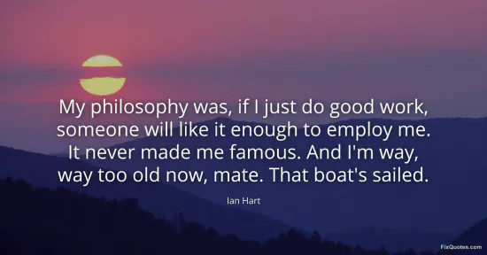 Hart, Ian. (2026, January 15). My philosophy was, if I just do good work, someone will like it enough to employ me. It never made me famous. And I'm way, way too old now, mate. That boat's sailed. FixQuotes. https://fixquotes.com/quotes/my-philosophy-was-if-i-just-do-good-work-someone-150933/