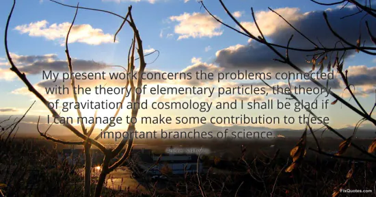 "My present work concerns the problems connected with the theory of elementary particles, the theory of gravitation and cosmology and I shall be glad if I can manage to make some contribution to these important branches of science." FixQuotes, 16 Jan. 2026, https://fixquotes.com/quotes/my-present-work-concerns-the-problems-connected-128215/. Accessed 12 Feb. 2026.