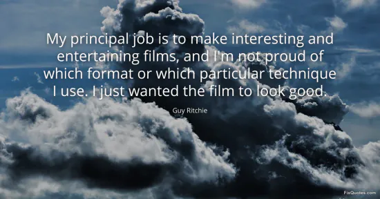 Ritchie, Guy. "My principal job is to make interesting and entertaining films, and I'm not proud of which format or which particular technique I use. I just wanted the film to look good." FixQuotes. January 18, 2026. https://fixquotes.com/quotes/my-principal-job-is-to-make-interesting-and-18313/.