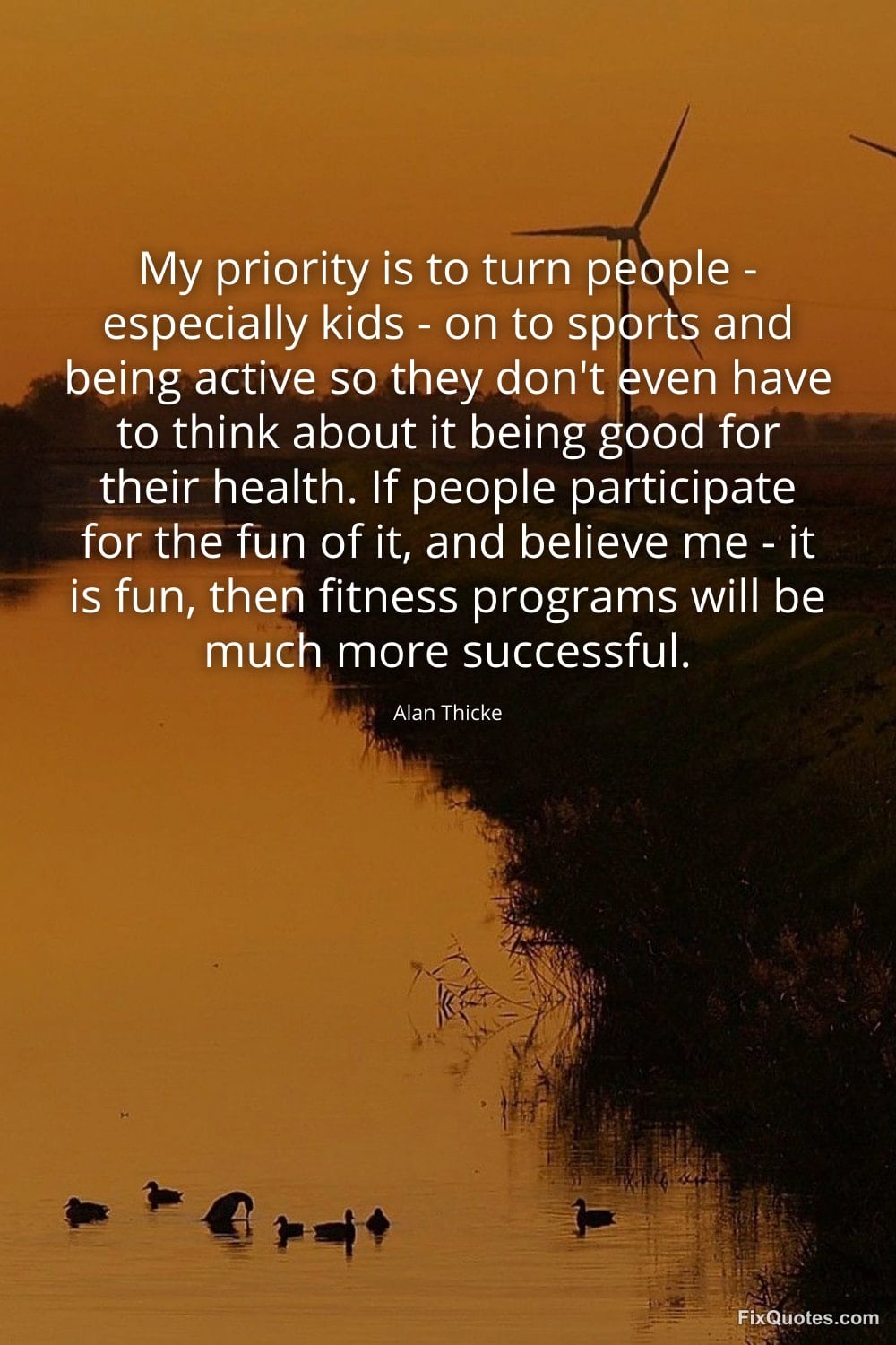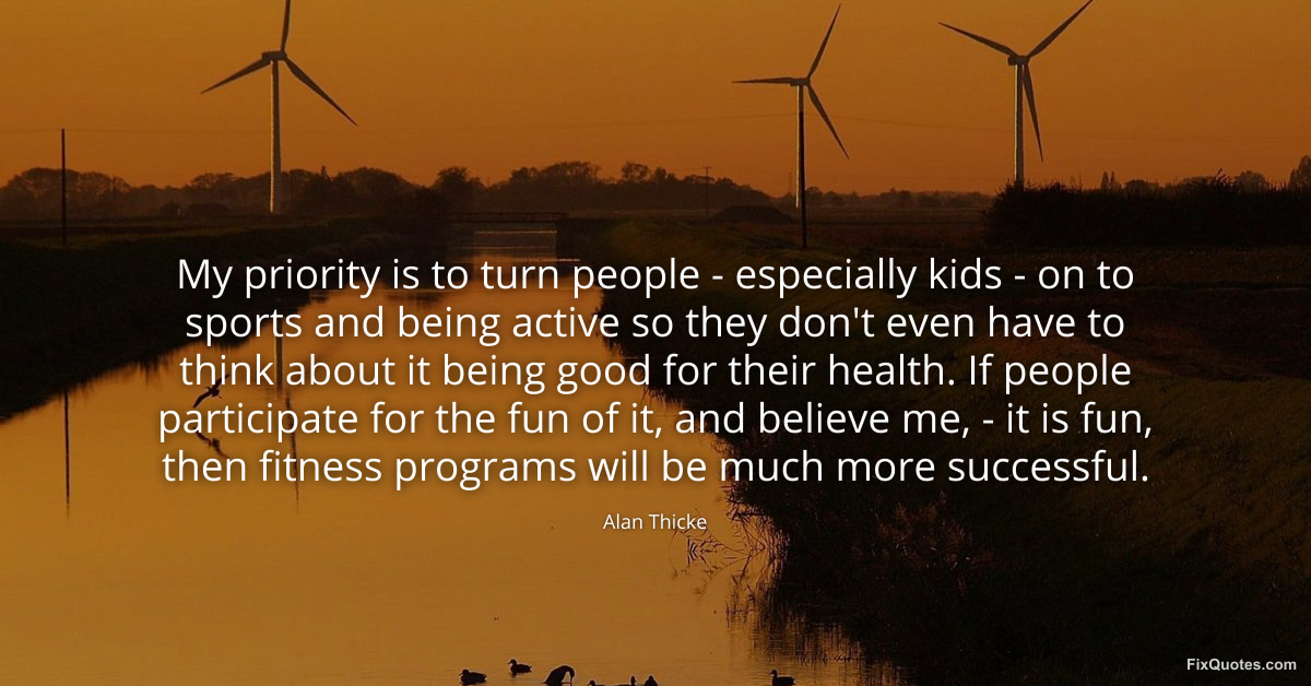Thicke, Alan. (2026, February 18). My priority is to turn people - especially kids - on to sports and being active so they don't even have to think about it being good for their health. If people participate for the fun of it, and believe me, - it is fun, then fitness programs will be much more successful. FixQuotes. https://fixquotes.com/quotes/my-priority-is-to-turn-people-especially-kids-60754/