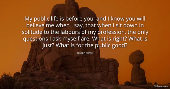 Howe, Joseph. "My public life is before you; and I know you will believe me when I say, that when I sit down in solitude to the labours of my profession, the only questions I ask myself are, What is right? What is just? What is for the public good?" FixQuotes. January 15, 2026. https://fixquotes.com/quotes/my-public-life-is-before-you-and-i-know-you-will-151701/.