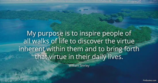 Shirley, William. "My purpose is to inspire people of all walks of life to discover the virtue inherent within them and to bring forth that virtue in their daily lives." FixQuotes. January 17, 2026. https://fixquotes.com/quotes/my-purpose-is-to-inspire-people-of-all-walks-of-72208/.