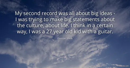 Sheik, Duncan. "My second record was all about big ideas - I was trying to make big statements about the culture, about life. I think in a certain way, I was a 27 year old kid with a guitar." FixQuotes. January 17, 2026. https://fixquotes.com/quotes/my-second-record-was-all-about-big-ideas-i-was-52455/.
