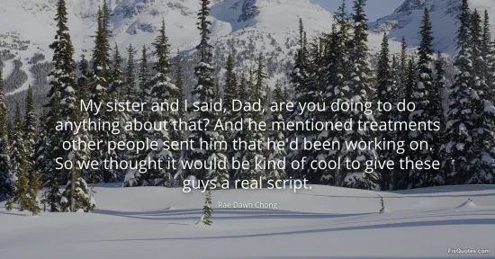 Chong, Rae Dawn. "My sister and I said, Dad, are you doing to do anything about that? And he mentioned treatments other people sent him that he'd been working on. So we thought it would be kind of cool to give these guys a real script." FixQuotes. January 16, 2026. https://fixquotes.com/quotes/my-sister-and-i-said-dad-are-you-doing-to-do-105747/.