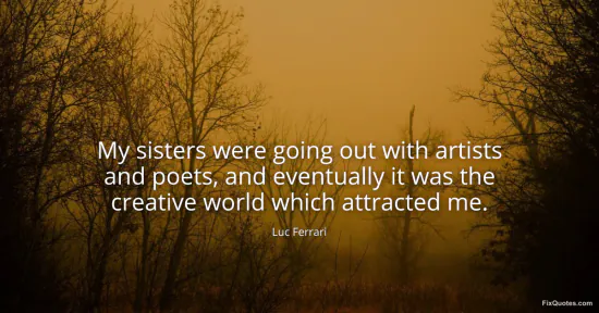 Ferrari, Luc. (2026, January 16). My sisters were going out with artists and poets, and eventually it was the creative world which attracted me. FixQuotes. https://fixquotes.com/quotes/my-sisters-were-going-out-with-artists-and-poets-134096/