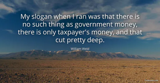 Weld, William. "My slogan when I ran was that there is no such thing as government money, there is only taxpayer's money, and that cut pretty deep." FixQuotes. January 16, 2026. https://fixquotes.com/quotes/my-slogan-when-i-ran-was-that-there-is-no-such-129585/.