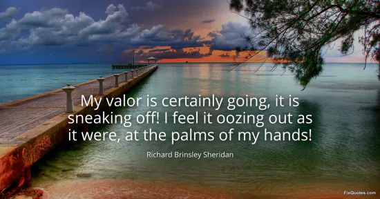 Sheridan, Richard Brinsley. (2026, January 16). My valor is certainly going, it is sneaking off! I feel it oozing out as it were, at the palms of my hands! FixQuotes. https://fixquotes.com/quotes/my-valor-is-certainly-going-it-is-sneaking-off-i-107524/
