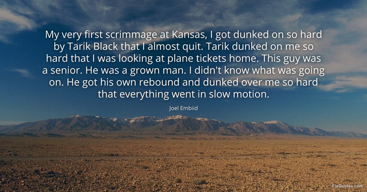 Embiid, Joel. (2026, January 30). My very first scrimmage at Kansas, I got dunked on so hard by Tarik Black that I almost quit. Tarik dunked on me so hard that I was looking at plane tickets home. This guy was a senior. He was a grown man. I didn't know what was going on. He got his own rebound and dunked over me so hard that everything went in slow motion. FixQuotes. https://fixquotes.com/quotes/my-very-first-scrimmage-at-kansas-i-got-dunked-on-184802/