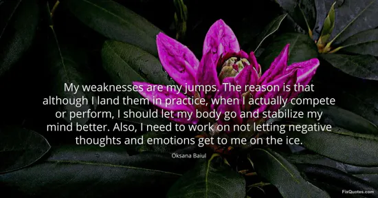 Baiul, Oksana. (2026, January 16). My weaknesses are my jumps. The reason is that although I land them in practice, when I actually compete or perform, I should let my body go and stabilize my mind better. Also, I need to work on not letting negative thoughts and emotions get to me on the ice. FixQuotes. https://fixquotes.com/quotes/my-weaknesses-are-my-jumps-the-reason-is-that-101105/