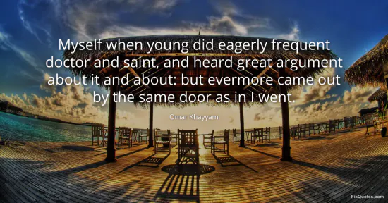 Khayyam, Omar. "Myself when young did eagerly frequent doctor and saint, and heard great argument about it and about: but evermore came out by the same door as in I went." FixQuotes. January 15, 2026. https://fixquotes.com/quotes/myself-when-young-did-eagerly-frequent-doctor-and-166442/.