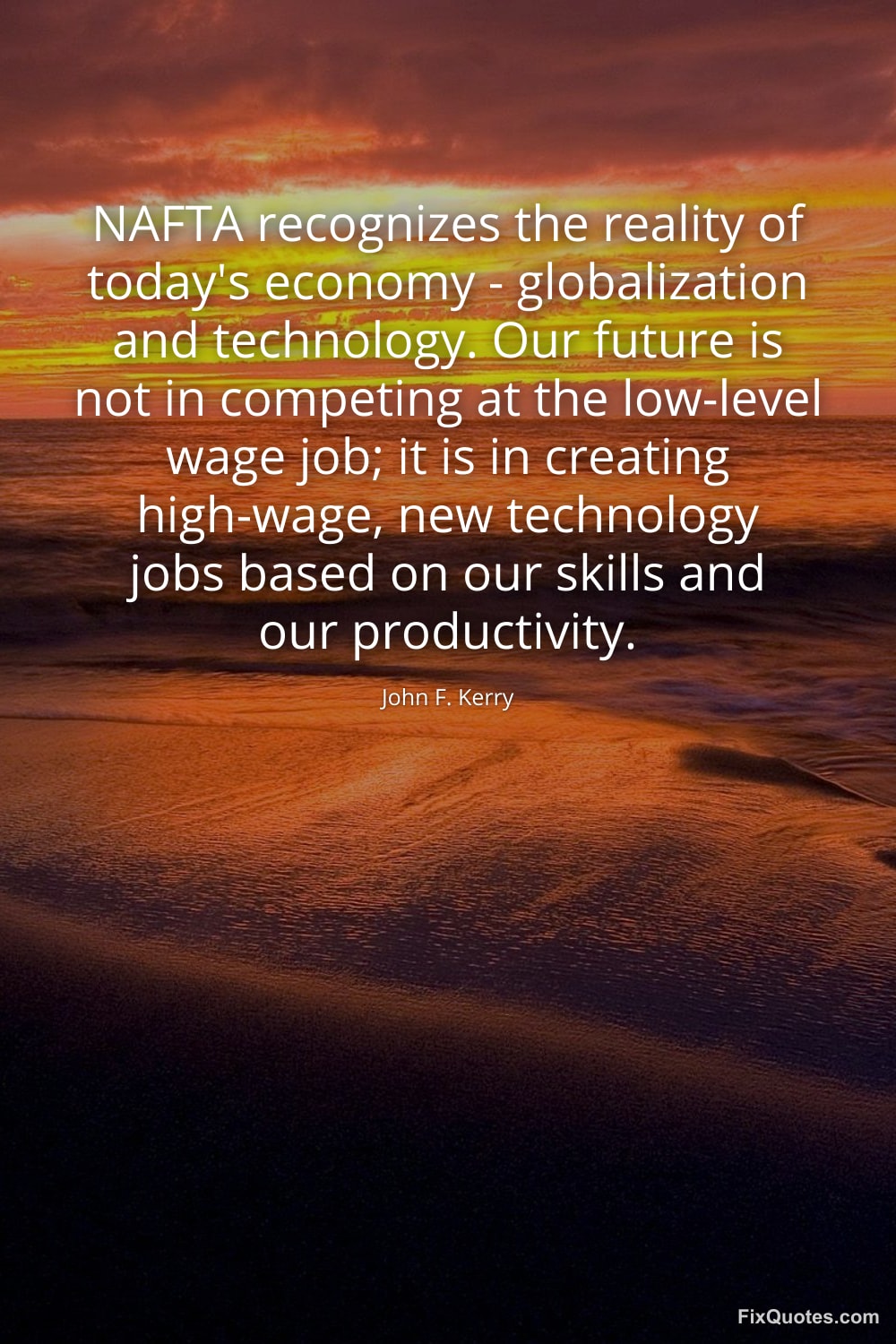 Kerry, John F. (2026, January 16). NAFTA recognizes the reality of today's economy - globalization and technology. Our future is not in competing at the low-level wage job; it is in creating high-wage, new technology jobs based on our skills and our productivity. FixQuotes. https://fixquotes.com/quotes/nafta-recognizes-the-reality-of-todays-economy-86609/