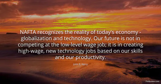 Kerry, John F. "NAFTA recognizes the reality of today's economy - globalization and technology. Our future is not in competing at the low-level wage job; it is in creating high-wage, new technology jobs based on our skills and our productivity." FixQuotes. January 16, 2026. https://fixquotes.com/quotes/nafta-recognizes-the-reality-of-todays-economy-86609/.