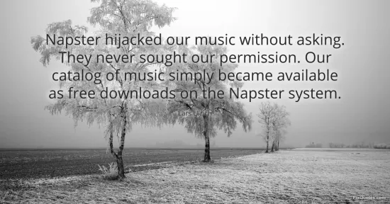Ulrich, Lars. "Napster hijacked our music without asking. They never sought our permission. Our catalog of music simply became available as free downloads on the Napster system." FixQuotes. January 16, 2026. https://fixquotes.com/quotes/napster-hijacked-our-music-without-asking-they-104241/.
