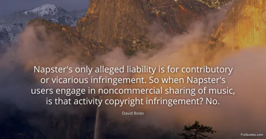 Boies, David. "Napster's only alleged liability is for contributory or vicarious infringement. So when Napster's users engage in noncommercial sharing of music, is that activity copyright infringement? No." FixQuotes. January 15, 2026. https://fixquotes.com/quotes/napsters-only-alleged-liability-is-for-141233/.