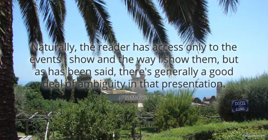Ford, John M. "Naturally, the reader has access only to the events I show and the way I show them, but as has been said, there's generally a good deal of ambiguity in that presentation." FixQuotes. January 15, 2026. https://fixquotes.com/quotes/naturally-the-reader-has-access-only-to-the-149677/.