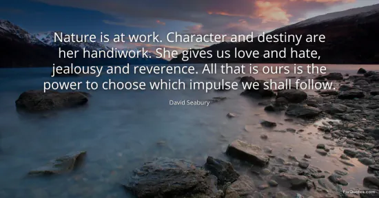 Seabury, David. (2026, January 15). Nature is at work. Character and destiny are her handiwork. She gives us love and hate, jealousy and reverence. All that is ours is the power to choose which impulse we shall follow. FixQuotes. https://fixquotes.com/quotes/nature-is-at-work-character-and-destiny-are-her-52859/