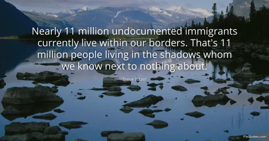 Israel, Steve. "Nearly 11 million undocumented immigrants currently live within our borders. That's 11 million people living in the shadows whom we know next to nothing about." FixQuotes. January 17, 2026. https://fixquotes.com/quotes/nearly-11-million-undocumented-immigrants-77532/.