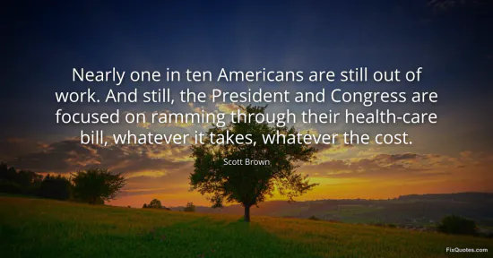 Brown, Scott. "Nearly one in ten Americans are still out of work. And still, the President and Congress are focused on ramming through their health-care bill, whatever it takes, whatever the cost." FixQuotes. January 16, 2026. https://fixquotes.com/quotes/nearly-one-in-ten-americans-are-still-out-of-work-129150/.