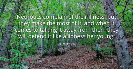 Freud, Sigmund. (2026, January 13). Neurotics complain of their illness, but they make the most of it, and when it comes to talking it away from them they will defend it like a lioness her young. FixQuotes. https://fixquotes.com/quotes/neurotics-complain-of-their-illness-but-they-make-41875/