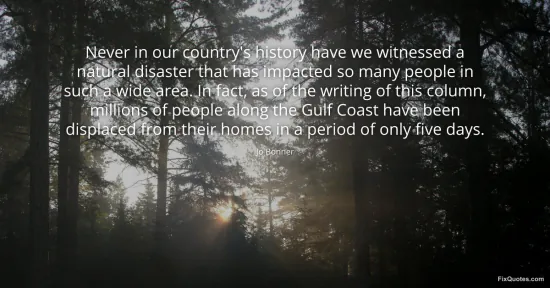 Bonner, Jo. (2026, January 17). Never in our country's history have we witnessed a natural disaster that has impacted so many people in such a wide area. In fact, as of the writing of this column, millions of people along the Gulf Coast have been displaced from their homes in a period of only five days. FixQuotes. https://fixquotes.com/quotes/never-in-our-countrys-history-have-we-witnessed-a-60656/