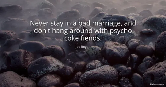 Rogan, Joe. "Never stay in a bad marriage, and don't hang around with psycho coke fiends." FixQuotes. January 17, 2026. https://fixquotes.com/quotes/never-stay-in-a-bad-marriage-and-dont-hang-around-60667/.