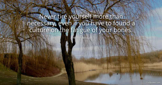 Artaud, Antonin. "Never tire yourself more than necessary, even if you have to found a culture on the fatigue of your bones." FixQuotes. January 16, 2026. https://fixquotes.com/quotes/never-tire-yourself-more-than-necessary-even-if-137855/.