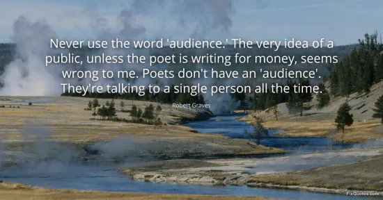 Graves, Robert. (2026, January 18). Never use the word 'audience.' The very idea of a public, unless the poet is writing for money, seems wrong to me. Poets don't have an 'audience'. They're talking to a single person all the time. FixQuotes. https://fixquotes.com/quotes/never-use-the-word-audience-the-very-idea-of-a-23810/