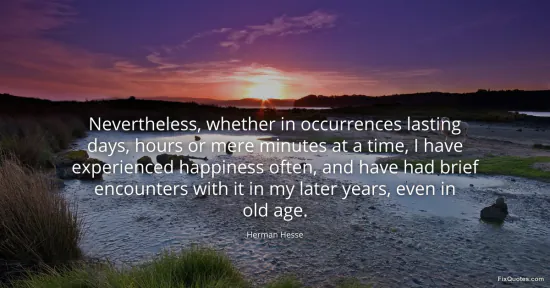 Hesse, Herman. (2026, January 17). Nevertheless, whether in occurrences lasting days, hours or mere minutes at a time, I have experienced happiness often, and have had brief encounters with it in my later years, even in old age. FixQuotes. https://fixquotes.com/quotes/nevertheless-whether-in-occurrences-lasting-days-48875/