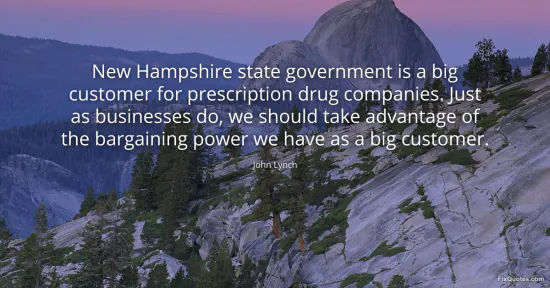 Lynch, John. "New Hampshire state government is a big customer for prescription drug companies. Just as businesses do, we should take advantage of the bargaining power we have as a big customer." FixQuotes. January 16, 2026. https://fixquotes.com/quotes/new-hampshire-state-government-is-a-big-customer-125309/.